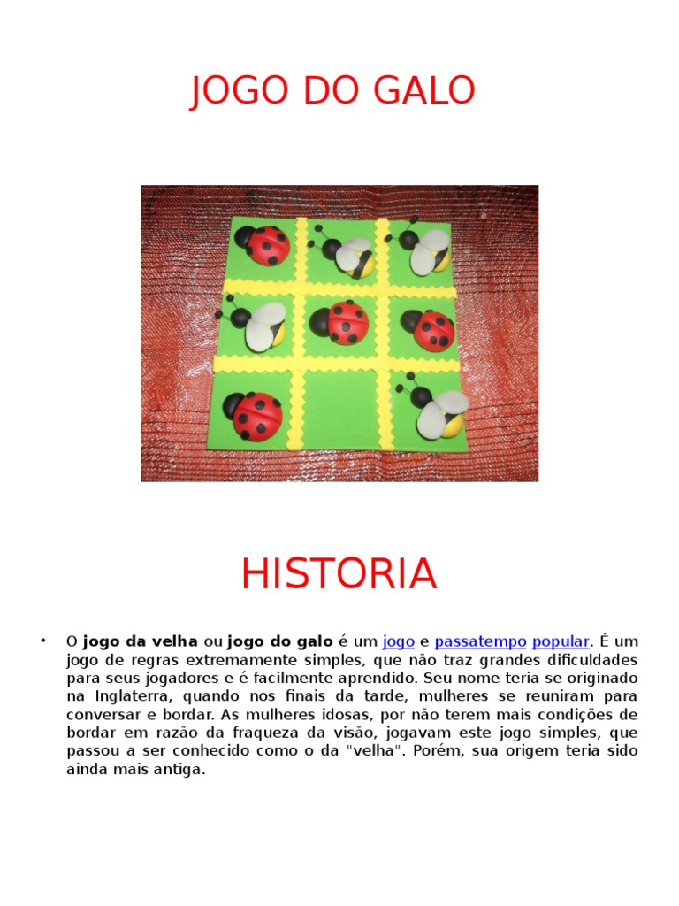 Um joga com a marca x e o outro com 0. Nenhuma opinião sobre jogo do galo. Clique numa imagem para ir ao grupo de jogos ou ao próprio jogo! O jogo de galo é um jogo que envolve dois jogadores: O jogo do galo pode ser jogado com um papel e lápis por dois jogadores que alternadamente vão desenhando um x e um o numa grelha de tamanho 3 x 3.